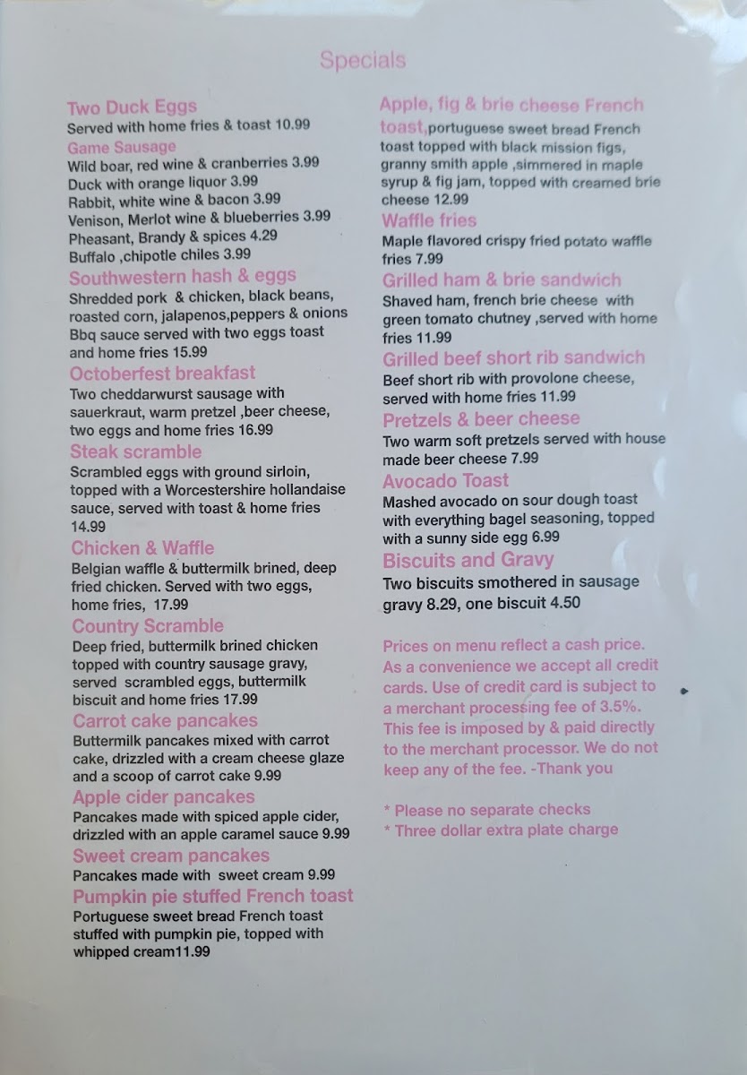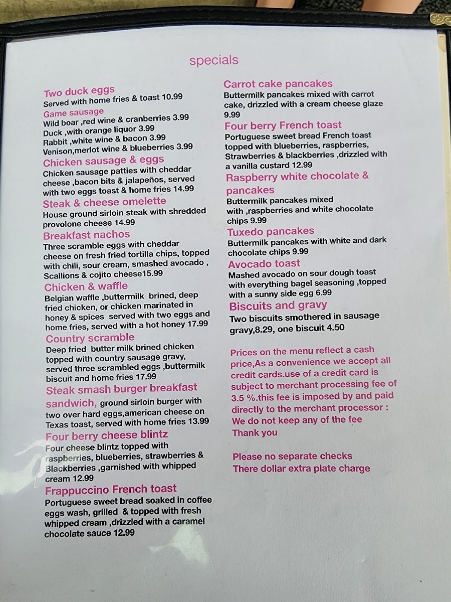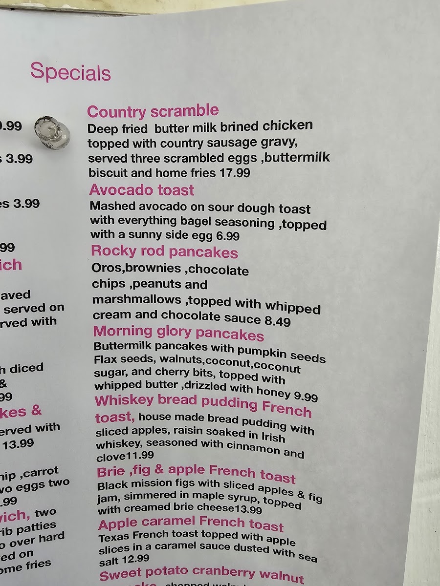 with portuguese sweet bread french toast, texas french toast, chocolate chip pancakes, cinnamon bread french toast or potato pancakes
