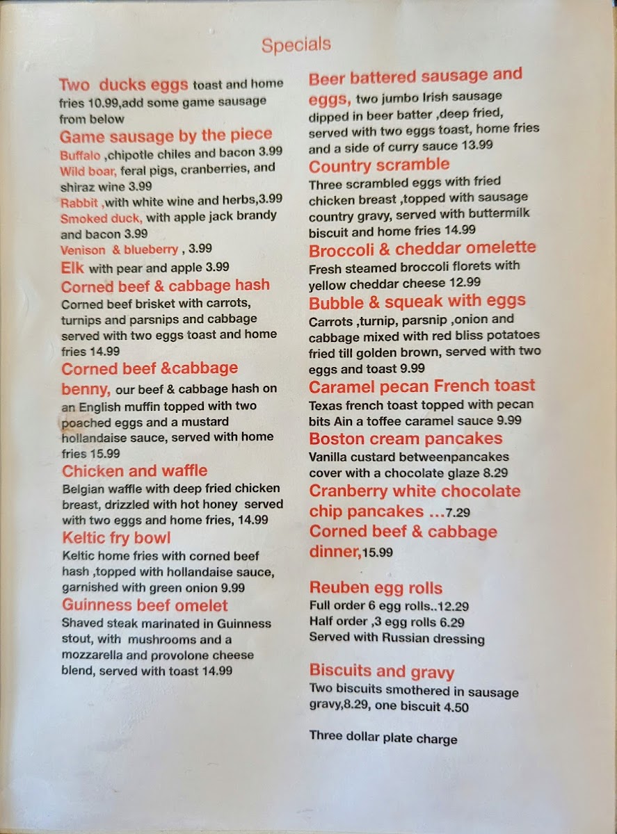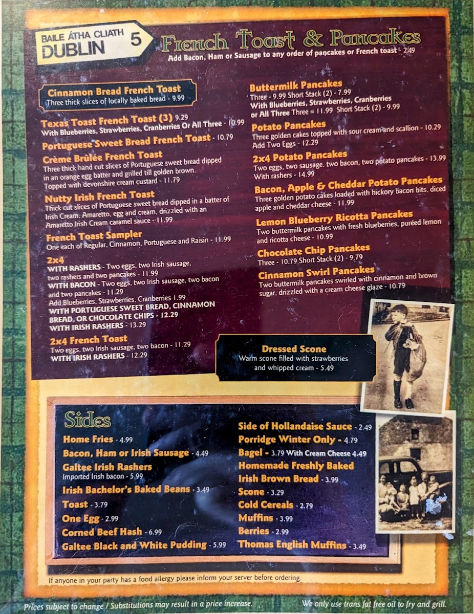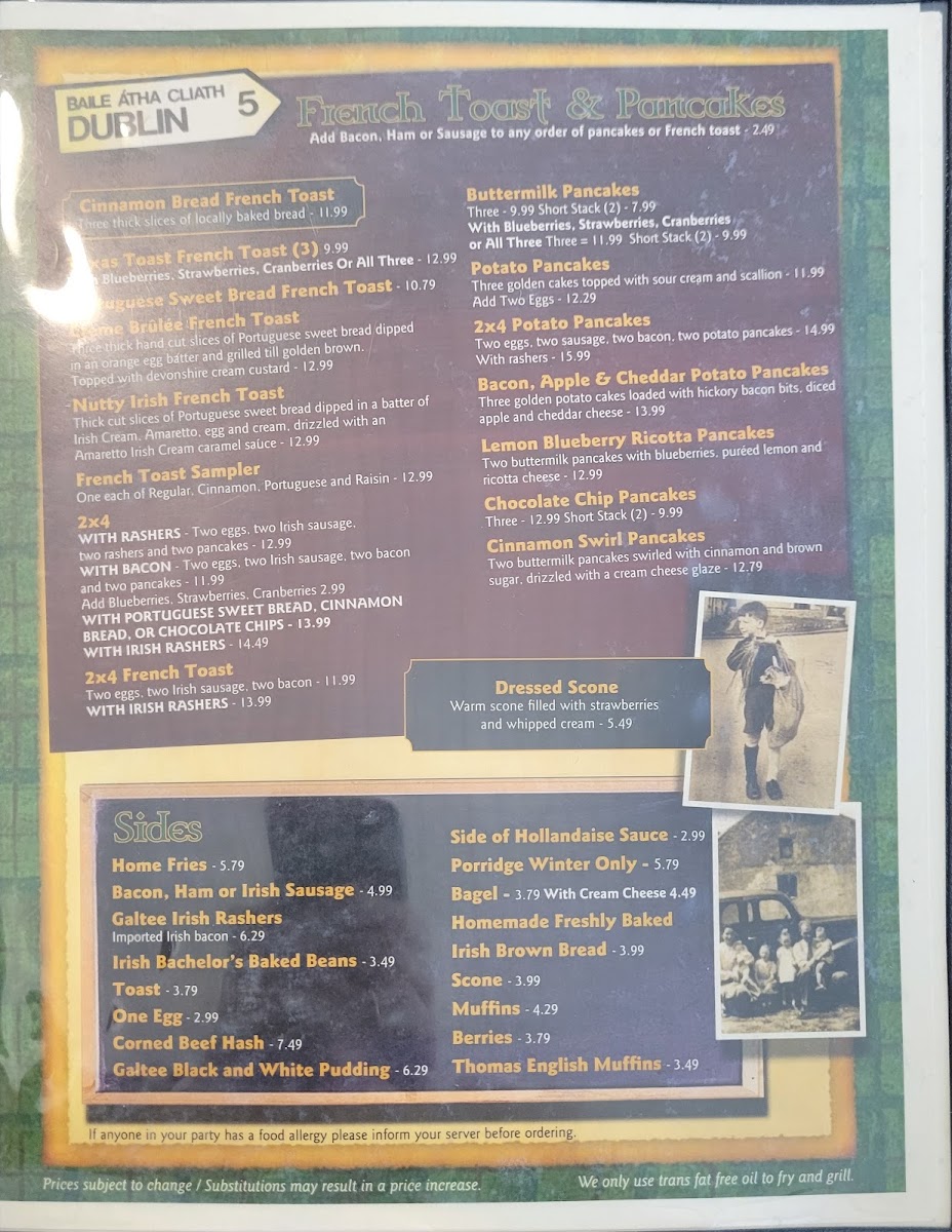 two eggs w/ rashes (irish bacon), or black & white pudding & brown bread, scone or toast, home fries or beans